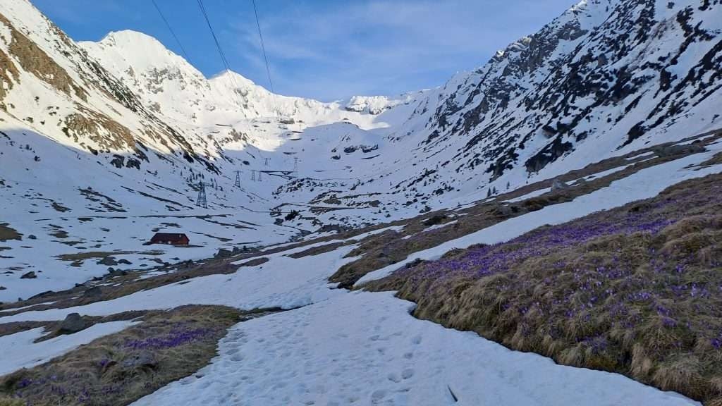 Die Grenze zwischen Winter und Frühling war erreicht an einem Krokusfeld, denn die Schneedecke war zunehmend dünner geworden und stellenweise verschwunden. An dieser Stelle verlief ebenfalls die Baumgrenze, da seitlich die ersten halbhohen Bäume zu sehen waren. Und während die Aussicht in Gehrichtung inzwischen von dichten, grünen Wäldern dominiert wurde, fiel der Blick zurück in die eisige und vegationslose Winterwelt des Bâlea-Sees.