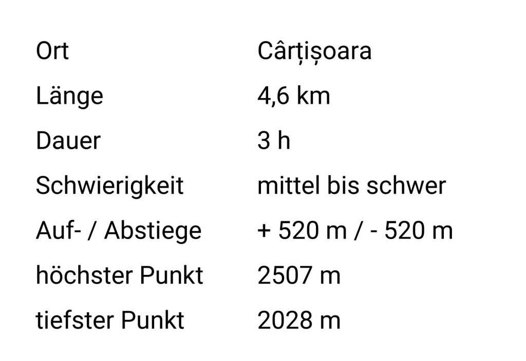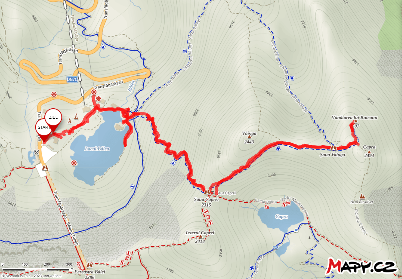 Diese Tour beginnt am Bâlea-See. Nach dem obligatorischen Blick ins Tal auf die Transfăgărașan und etwas Zeit am Seeufer geht es hinauf zur Șaua Caprei, einem Joch zwischen den beiden Bergen Văiuga und Iezerul Caprei. Im Hang des Văiuga verläuft der Pfad oberhalb des Lacul Capra, des „Schwestersees“ des Bâlea Lac bis kurz vor den Gipfel des Bergs Capra. Der blauen Markierung folgend wird der Vânătoarea lui Buteanu erreicht, der neunthöchste Berg Rumäniens.