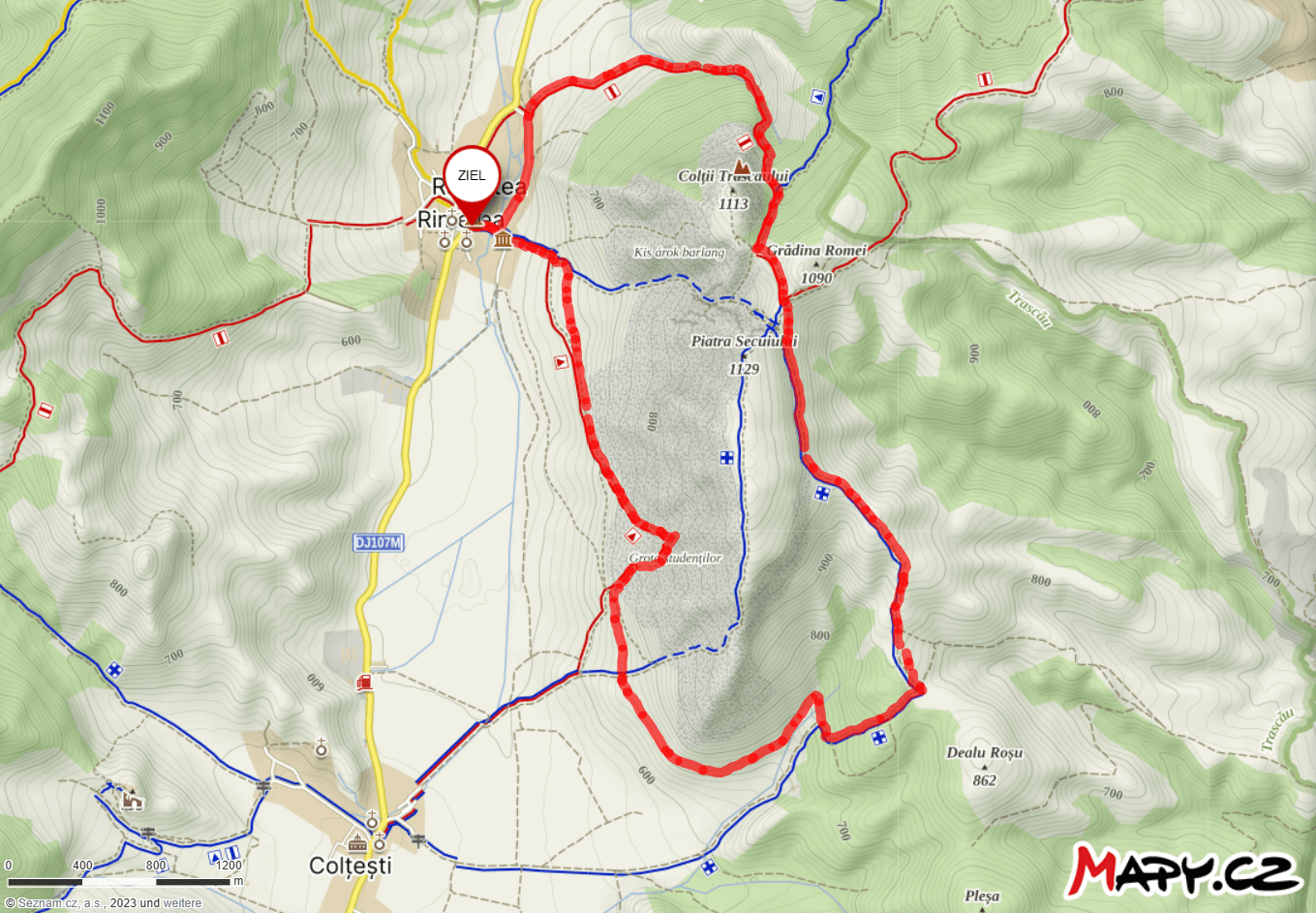 Ein beliebter Abstecher an der Westseite des Bergs führt hinauf zur Grota Studenților, der Studentengrotte, einer nach beiden Seiten offenen Höhle im Berg. Dabei schweift der Blick immer wieder über das weitläufige Tal, in dem Rimetea und der Nachbarort Colțești liegen sowie auf die Hänge des gegenüberliegenden Bergs Ardașcheia (1.249 m) mit ihren ungewöhnlichen Baumreihen. Allerdings ist der Aufstieg relativ steil und der Abstieg sehr geröllhaltig, so dass dieser Abstecher ziemlich kräftzehrend ist.