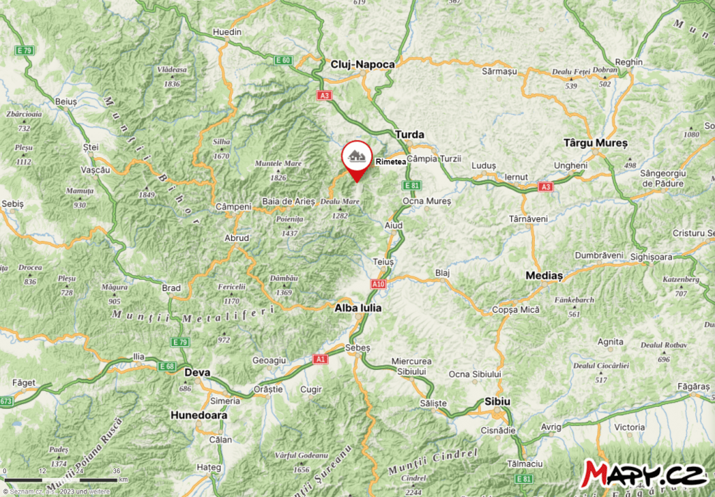 Rimetea liegt ungefähr 60 Kilometer südlich von Cluj-Napoca (Klausenburg) am Fuß des Bergs Piatra Secuiului, dessen deutscher Name Szeklerstein lautet. Szekler sind die ungarischsprachige Minderheit in Rumänien, der die meisten Einwohner von Rimetea angehören. Rimetea ist in ganz Rumänien bekannt für seine einheitlichen weißen Häuser und gilt als eines der schönstens Dörfer des Landes.